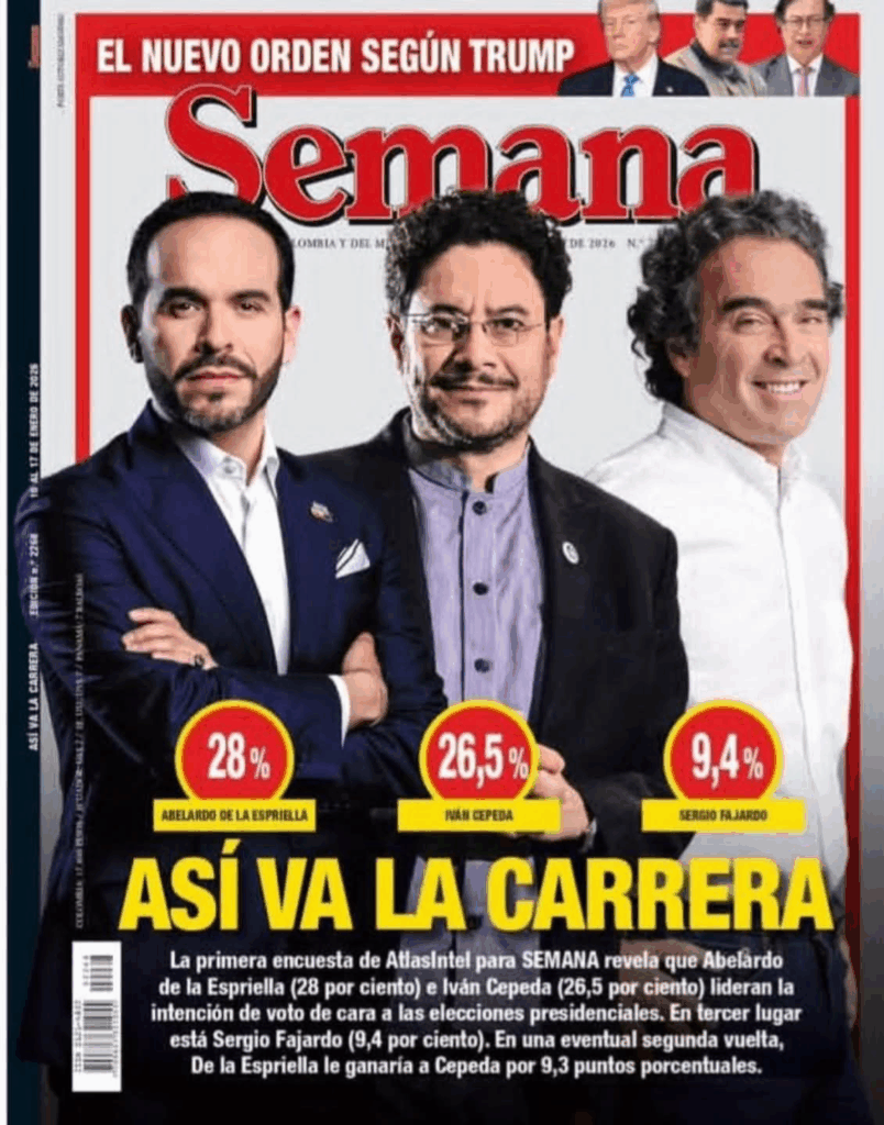 A cinco meses de los próximos comicios presidenciales, Semana reveló los resultados de la primera encuesta desarrollada por la firma para el medio, la cual señala una competenciacerrada entre dos figuras: Abelardo de la Espriella, que lidera con 28% de la intención de voto, e Iván Cepeda, que suma 26,5%.