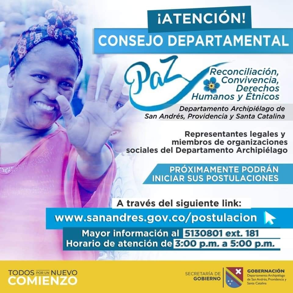 La Secretaria de Gobierno Departamental invitó a representantes legales y miembros de las organizaciones Sociales de San Andrés, Providencia y Santa Catalina, a estar atentos a la apertura de la convocatoria para ser miembros del Consejo Departamental de Paz, Reconciliación, Convivencia, Derechos Humanos y Derechos Étnicos del Departamento de San Andrés, Providencia y Santa Catalina.