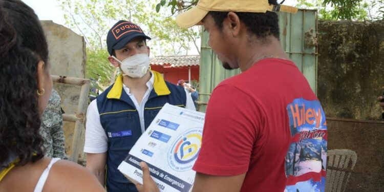 Esta misma tarde brigadistas de los organismos de socorro y de la Unidad Nacional de Gestión del Riesgo de Desastres, UNGRD iniciaron la labor de entrega de mercados liderado por el Ministerio del Interior en la isla de San Andrés través de la campaña Colombia Está Contigo, Un Millón de Familias.
