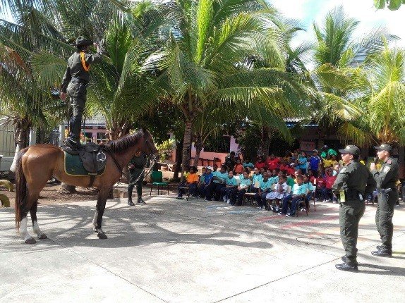 Durante esta charla, se interactuó con los alumnos algunas preguntas de seguimiento incentivándolos con algunos pequeños kits. Siguiendo a esto se le realizo una demostración de show con los equinos; esta actividad tuvo gran acogida entre los niños niñas y profesores de esta institución los cuales como al finalizar las actividades jugaron y gozaron libremente en los inflables de la Policía Nacional.