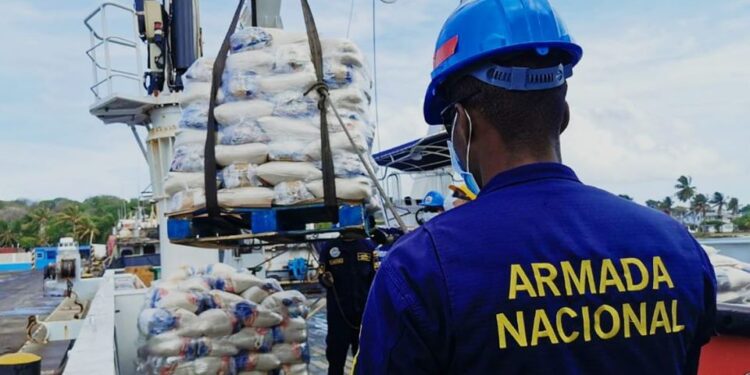 13.4 toneladas de ayudas humanitarias, consistentes en 675 kits alimentarios que beneficiarán a las familias que se han visto afectadas desde la declaración de la emergencia humanitaria ocasionada por el COVID–19, fueron transportadas por la Armada de Colombia y la Dirección General Marítima-DIMAR, desde la isla de San Andrés hasta la isla de Providencia a bordo del buque ARC “Roncador”.