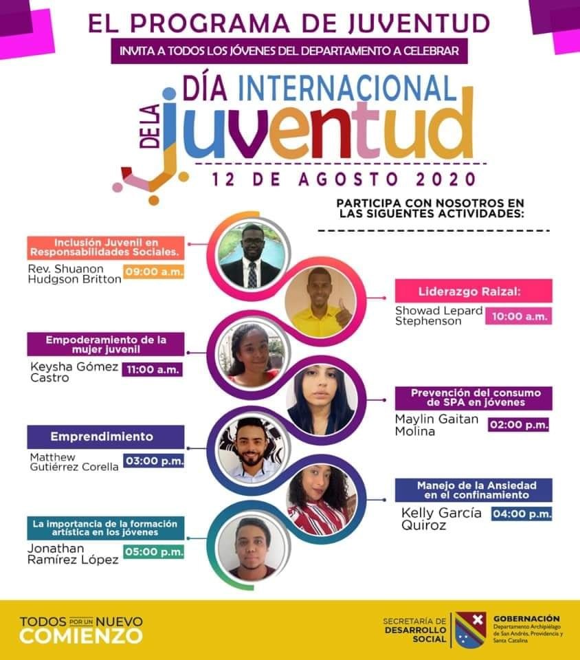 La Gobernación de San Andrés encabezada por el gobernador Everth Julio Hawkins Sjogreen, mediante el programa de juventud adscrito a la Secretaria de Desarrollo Social lleva a cabo una serie de importantes actividades virtuales con todos los jóvenes del departamento en marco de la celebración del Día Internacional de la juventud este 12 de agosto de la siguiente manera: