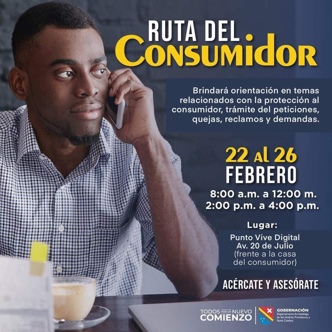 Con el objetivo de velar y garantizar los derechos del consumidor, la Superintendencia de Industria y Comercio estará presente en San Andrés del 22 al 26 de febrero y la apoyaremos el desarrollo de las actividades que, como Secretaría Técnica de la Red Nacional de Protección al Consumidor se han puesto en marcha, a través de la realización de varios programas como la #RutaDelConsumidor que tiene como objetivo difundir y proteger los derechos del consumidor a lo largo del territorio nacional.