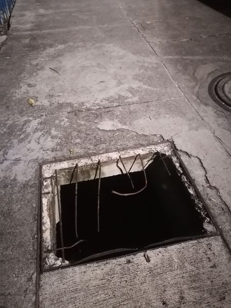Esta tapa de una conexión subterránea eléctrica es una verdadera trampa mortal, sobre el anden de la Avenida Newball frente al hotel Sunrise Beach.