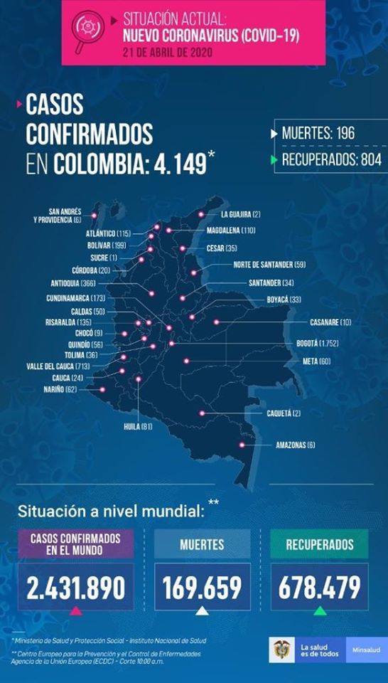 El Ministerio de Salud Nacional presentó el informe de hoy en el que se reportan un total de 172 casos nuevos de SARS CoV2 (Covid19) o Nuevo Coronavirus de la siguiente manera: Bogotá (82), Valle (30), Santa Marta (15),Nariño (10),Risaralda (5),Barranquilla (4),Tolima (4),Antioquia (3),Meta (3),Cartagena (3), Cundinamarca (3),Magdalena (2),Amazonas (2),Huila (2),Chocó (1),Quindío (1),Bolívar (1) y Santander (1).