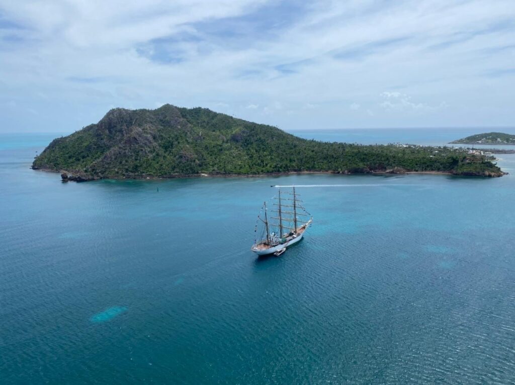 La vista desde el puente de mando del ARC ”Golfo de Urabá” al momento de emplayar en la Isla de Santa Catalina para desembarcar ayudas humanitarias y materiales de reconstrucción.