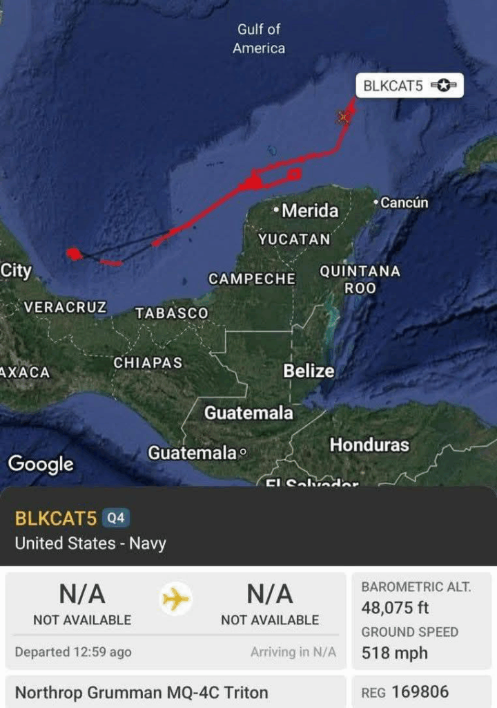 La madrugada de este jueves se reportó un dron de reconocimiento, modelo MQ-4C Tritón fabricado por Northrop Grumman, que habría volado cerca de las costas mexicanas de Yucatán, Campeche, Tabasco y Veracruz.