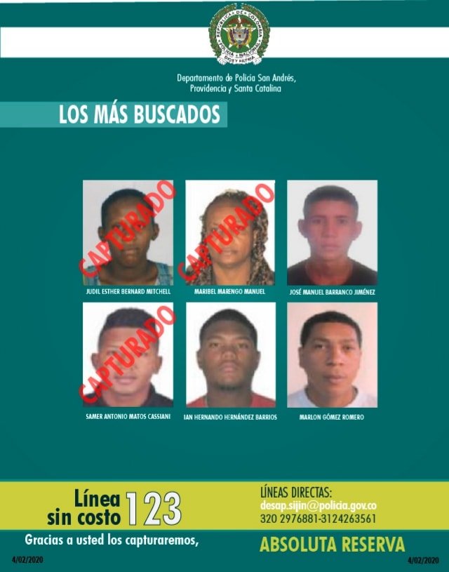 Los cuatro ciudadanos eran requeridos mediante orden judicial emanada por la Fiscalía 2 Especializada de San Andrés, por los delitos de concierto para delinquir y tráfico, fabricación o porte de estupefacientes. Las mujeres que hacían parte del cartel de los más buscados de archipiélago, publicado a inicios del 2020.
