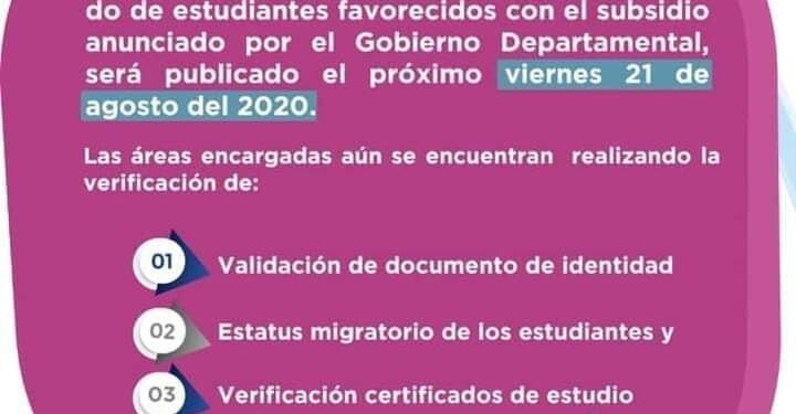 El viernes 21 de agosto se dará a conocer listado de estudiantes favorecidos con las ayudas humanitarias anunciadas por el gobernador