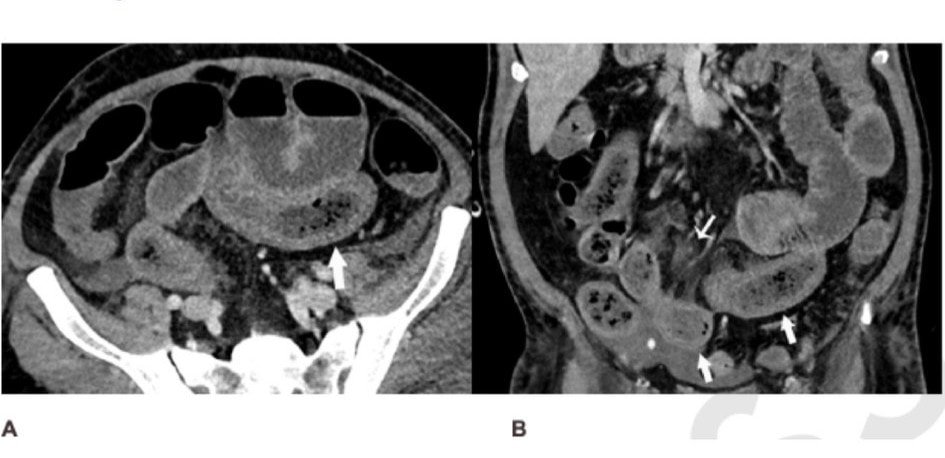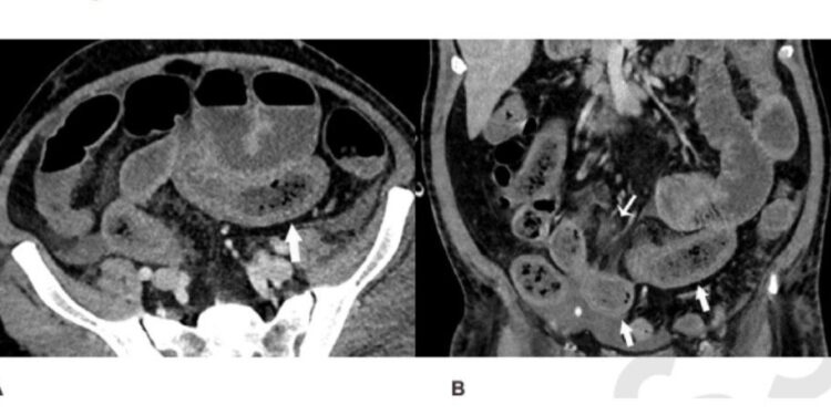 Una tomografía computarizada del abdomen y la pelvis de un hombre de 57 años sospechoso de tener un suministro de sangre deficiente en el intestino. La exploración muestra que su intestino delgado estaba distendido y engrosado en partes. Foto: Radiological Society of North America