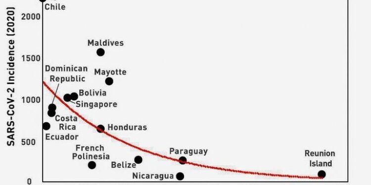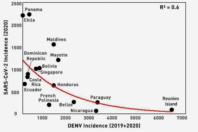 La correlación exponencial inversa entre la incidencia de casos de COVID-19 como una función de la incidencia del dengue en una muestra de países de América Latina, Asia y algunas islas en los océanos Pacífico e Índico en esta imagen sin fecha.
