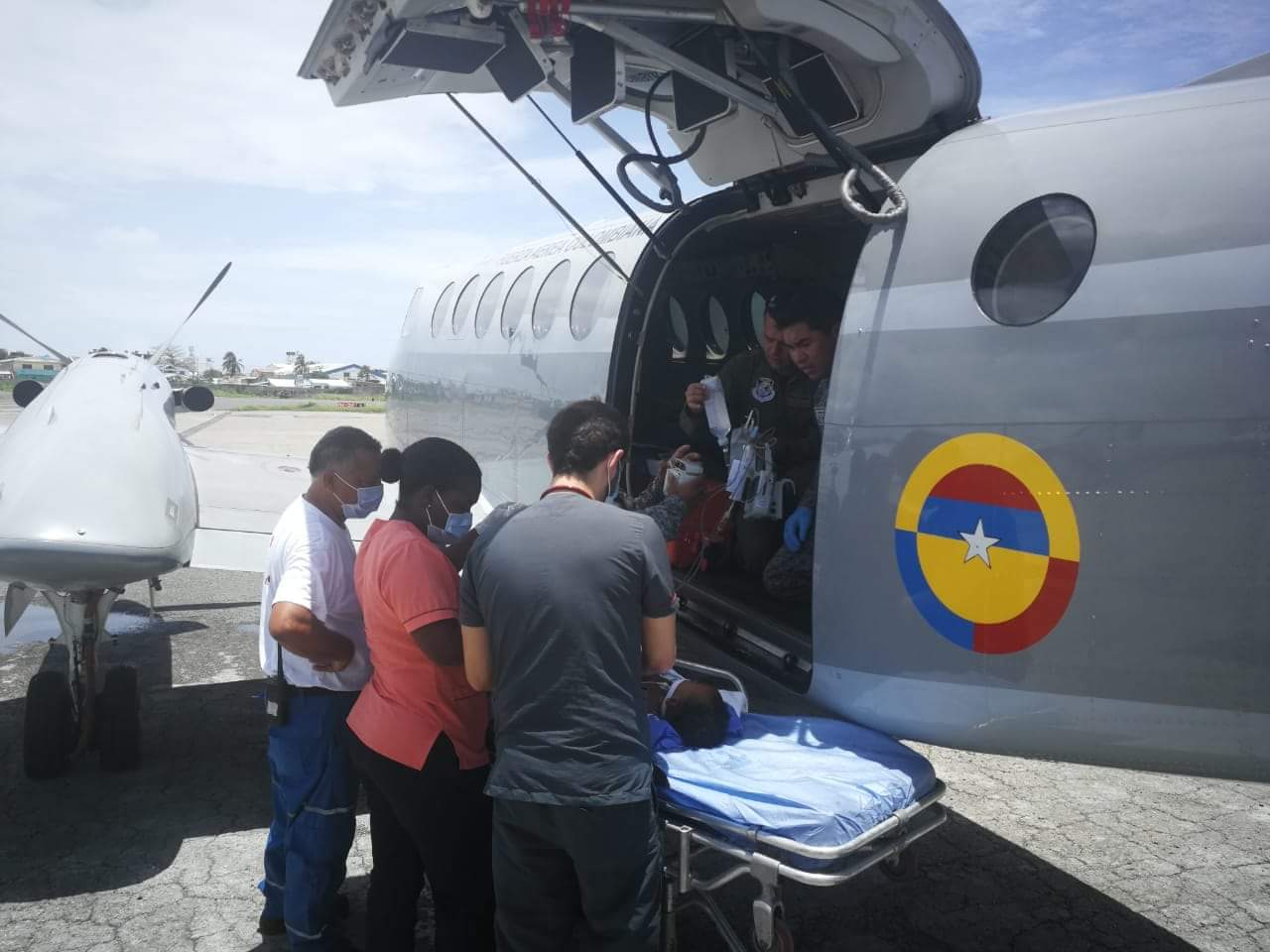 El personal médico del Hospital Clarence Lynd Newball, entregaron el paciente a los guerreros del aire especializados en el área de la salud, quienes cumplieron la importante misión de cuidar la vida del niño durante el vuelo.