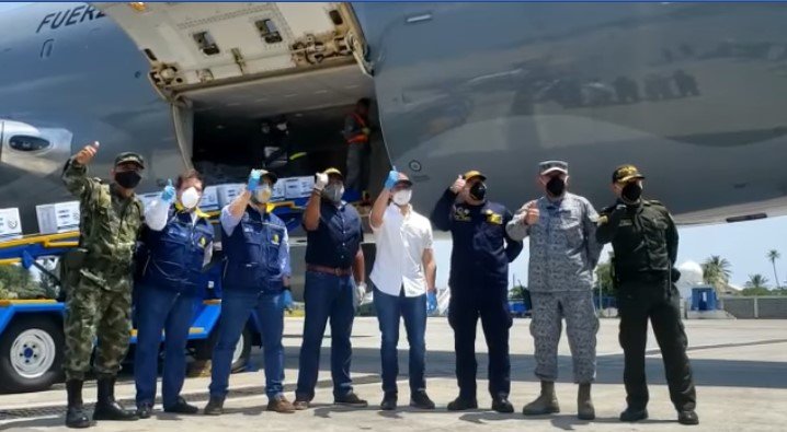 El Comando Específico de Andrés y Providencia con sus componentes de Armada de Colombia, Ejército Nacional y Fuerza Aérea Colombiana, así como la Policía Nacional, reciben a esta hora al señor Viceministro de Relaciones Políticas, Daniel Palacios, Viceministro de Defensa Jairo García, Director General UNGRD Eduardo José Ángulo y el Asesor del Ministerio del Interior, Mario Contreras, quienes arriban desde la ciudad de Bogotá, con ayudas humanitarias, consistentes en 1.200 kits alimentarios para la comunidad isleña y raizal del archipiélago. #UnidosporelArchipiélago.