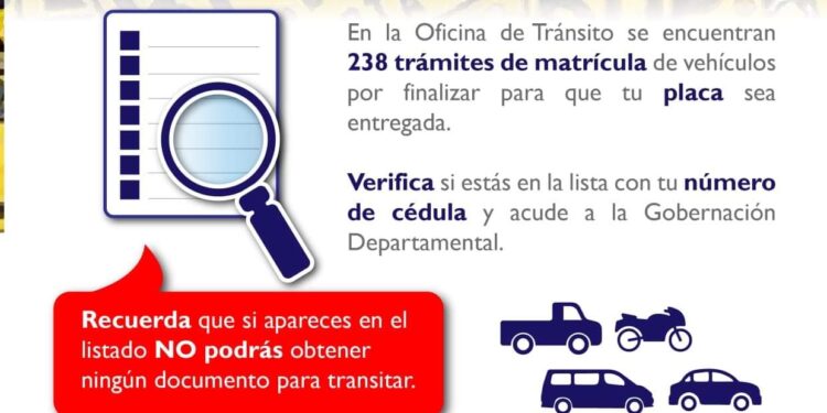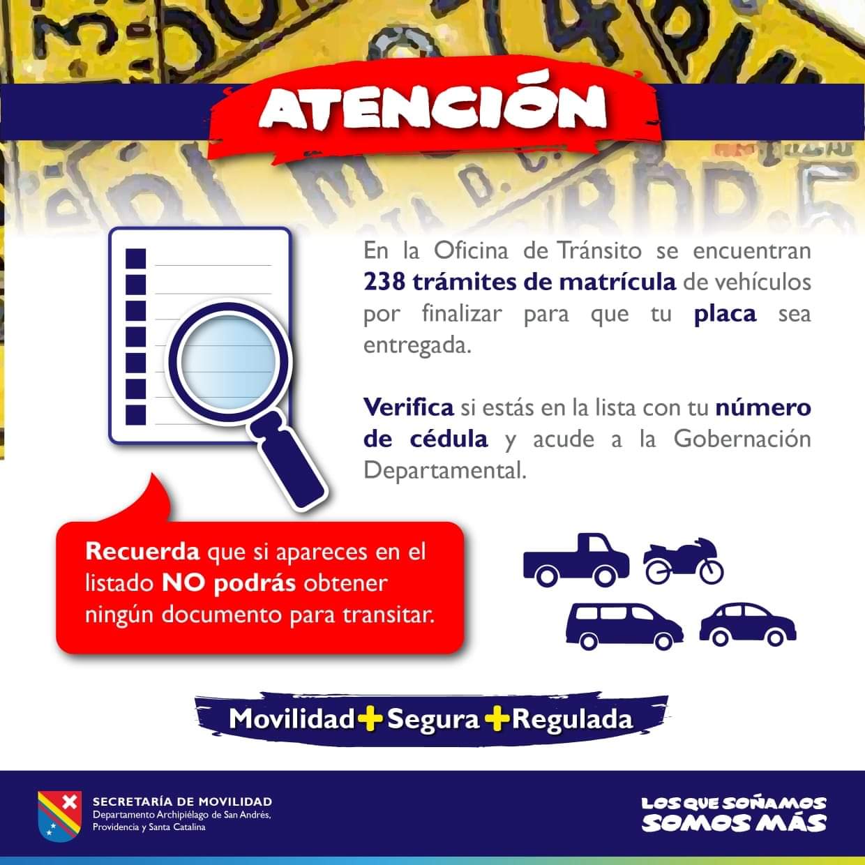 El Gobierno Departamental a través de la Secretaría de Movilidad, se permite informar y otorgar un nuevo listado con 238 personas que deben finalizar su trámite de matrículas para que sus placas que fueron previamente asignadas les sean entregadas.