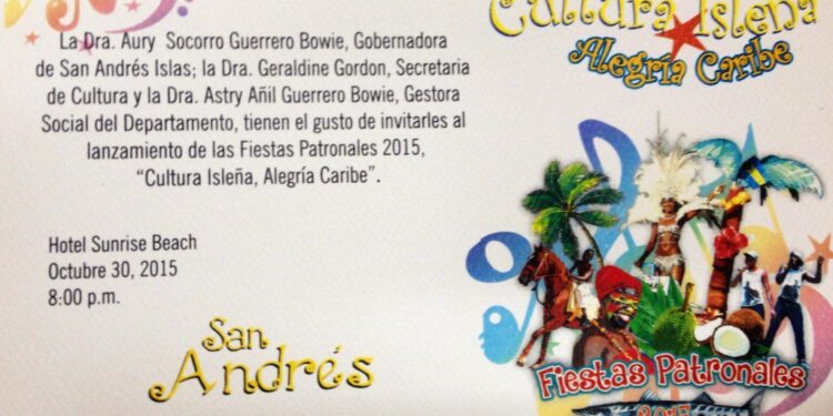 La Gobernación del Departamento de San Andrés, Providencia y Santa Catalina en cabeza de la señora Gobernadora Aury Guerrero Bowie con el apoyo de la Secretaría de Cultura y de Gestora Social del Departamento Astry Guerrero, estarán realizando hoy viernes 30 de octubre el lanzamiento de las Fiestas Patronales de San Andrés 2015, “Cultura Isleña, Alegría Caribe”, acto que es el preámbulo de lo que serán estas celebraciones tradicionales y permite continuar con el rescate de nuestras conmemoraciones.