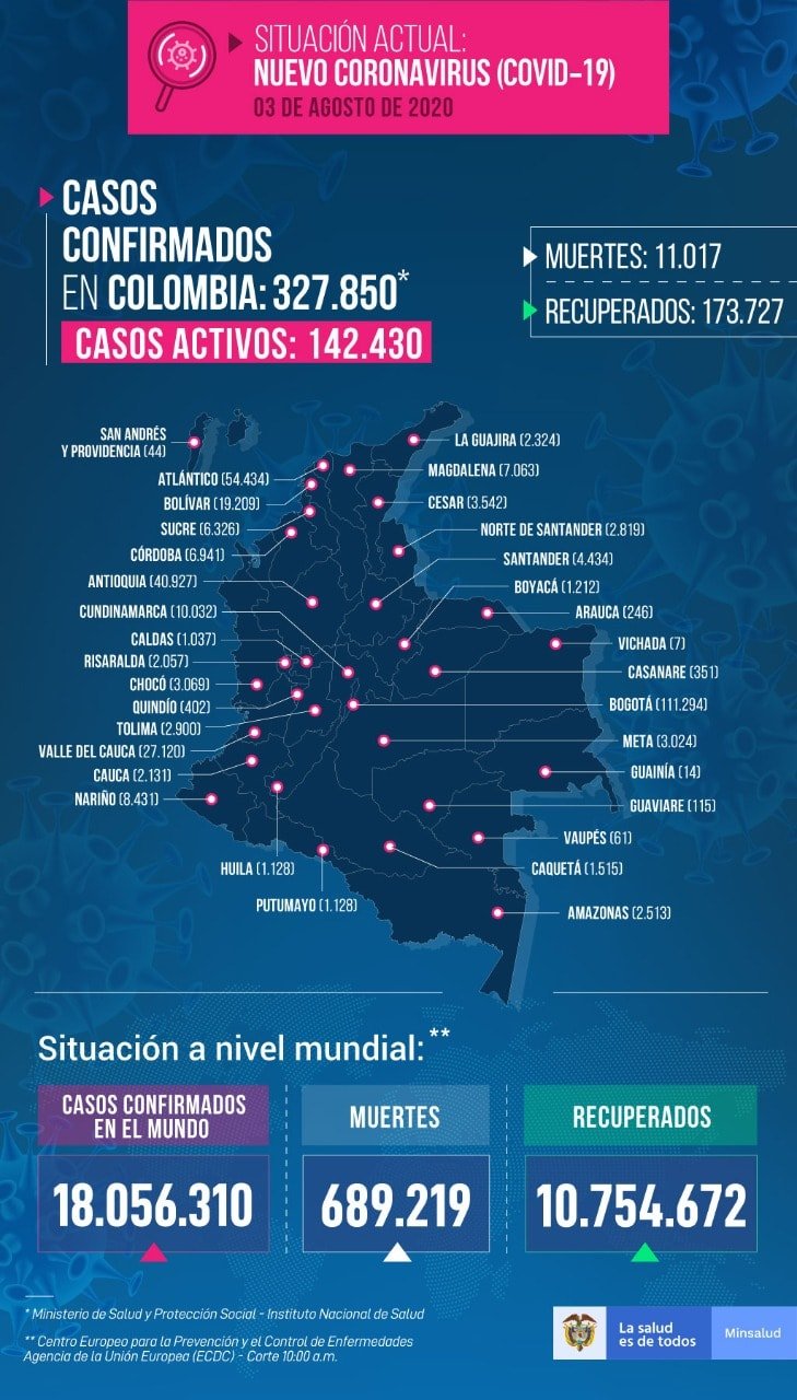El Ministerio de Salud confirmó hoy otros dos casos nuevos de Covid19 en San Andrés y 10.199 nuevos casos en toda Colombia por lo que el total de casos asciende a 327.850.