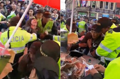 LÍDER DE TRABAJADORES INFORMALES DEBATE CON UNIFORMADOS DE LA POLICÍA QUE INTENTAN DESMONTAR UN PUESTO DE TRABAJO CALLEJERO EN BOGOTÁ