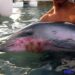 Ayudan a bebe delfin atascada y herida entre arrecifes