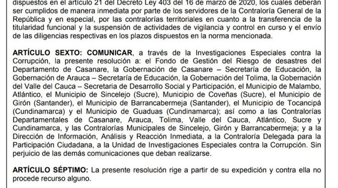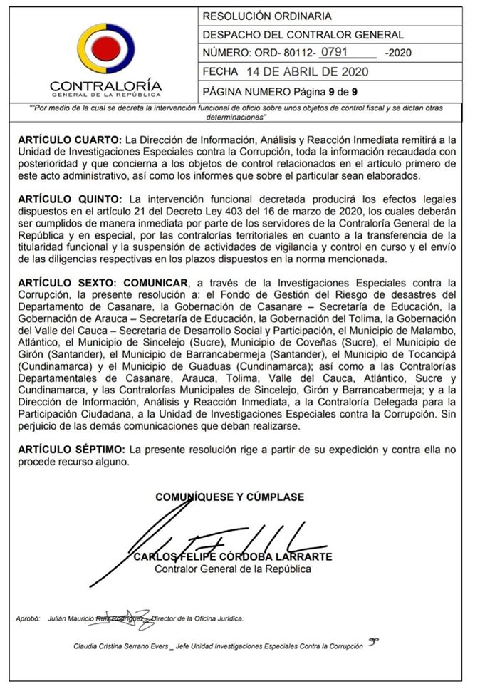 Gobernación de Arauca – Secretaría de Educación, la Gobernación del Tolima, la Gobernación del Valle del Cauca – Secretaria de Desarrollo Social y Participación, el Municipio de Malambo, Atlántico, el Municipio de Sincelejo (Sucre), Municipio de Coveñas (Sucre), el Municipio de Girón (Santander), el Municipio de Barrancabermeja (Santander), el Municipio de Tocancipá(Cundinamarca) y el Municipio de Guaduas (Cundinamarca); así como a las Contralorías Departamentales de Casanare, Arauca, Tolima, Valle del Cauca, Atlántico, Sucre y Cundinamarca, y las Contralorías Municipales de Sincelejo, Girón y Barrancabermeja; y a la Dirección de Información, Análisis y Reacción Inmediata, a la Contraloría Delegada para la Participación Ciudadana, a la Unidad de Investigaciones Especiales contra la Corrupción. Sin perjuicio de las demás comunicaciones que deban realizarse.