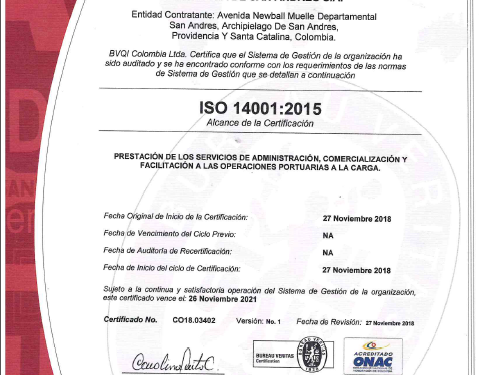 La Sociedad Portuaria viene adelantando este proceso desde el año 2014 cuando se inició el trámite de certificación a la gestión portuaria logística por ser el único puerto que hasta entonces no tenía certificación de calidad, y para ello tuvo la participación de todo el recurso humano de la empresa portuaria, cumpliendo de manera rigurosa con unos estándares que están determinados por una norma internacional avalada por una ONG mundial con sede en Ginebra, que propende por lograr la calidad de procesos, de servicio, de infraestructura, de ambiente de trabajo en cualquier organización empresarial, y esa certificación significa que en San Andrés hay un puerto que aunque es pequeño, cumple con los requisitos de cualquier puerto grande a nivel mundial y esto implica un desarrollo superior buscando un mejoramiento permanente