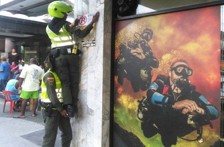 Policía de tránsito así sea sobre los hombros de sus compañeros llama la atención con campaña para parquear donde se debe.