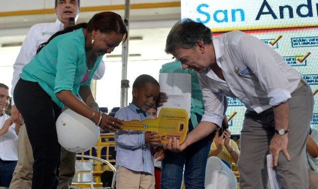 El Presidente Juan Manuel Santos declaró este miércoles en San Andrés que ama esa región del país y por eso ha ido tantas veces. “Que sigamos trabajando juntos por el desarrollo y el bienestar de los sanandresanos”, expresó en la capital isleña, donde entregó las primeras viviendas rurales gratuitas a beneficiarios de la Red Unidos, entre ellos la familia de Wendy Diulk, en compañía del Ministro de Agricultura, Aurelio Iragorri.