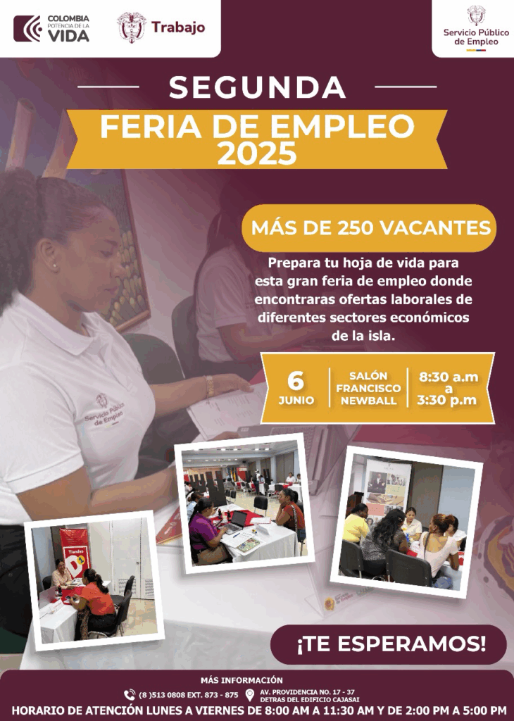 Si te encuentras en busca de empleo, esta feria es para ti, tendremos más de 250 vacantes con posibilidad de selección inmediata para los diferentes sectores comerciales y de servicio de la isla, preparará tu hoja de vida para este 6 de junio en el Auditorio Francisco Newball del Edificio CAJASAI.