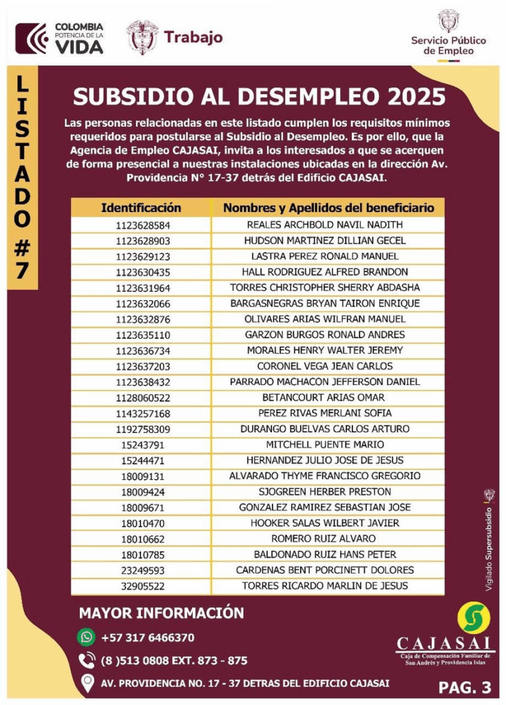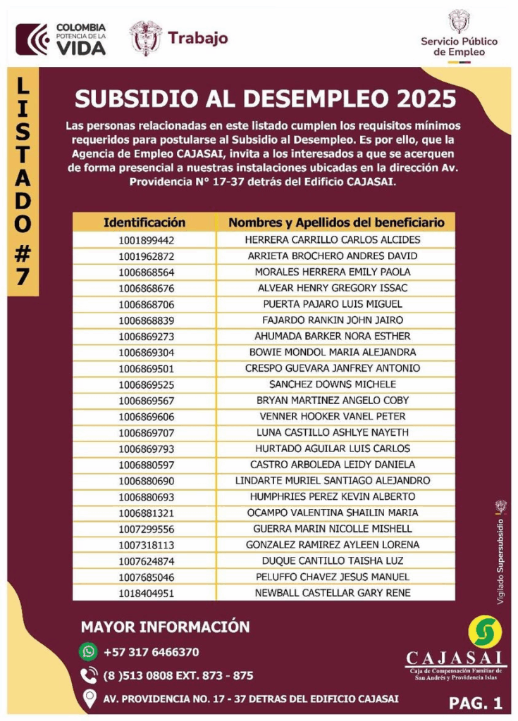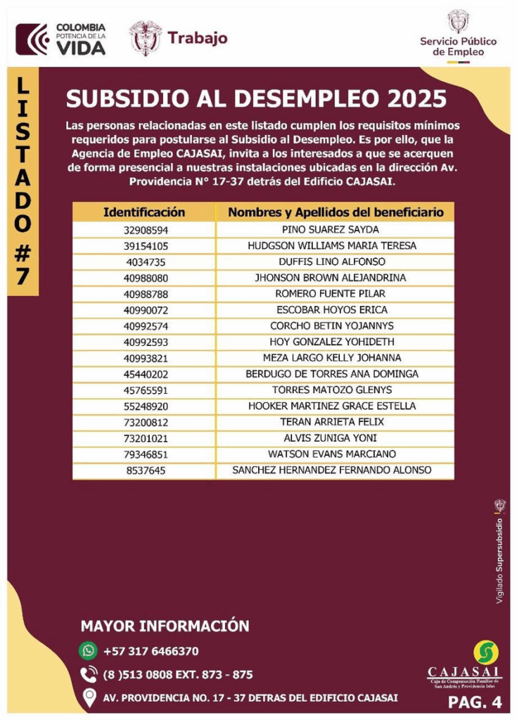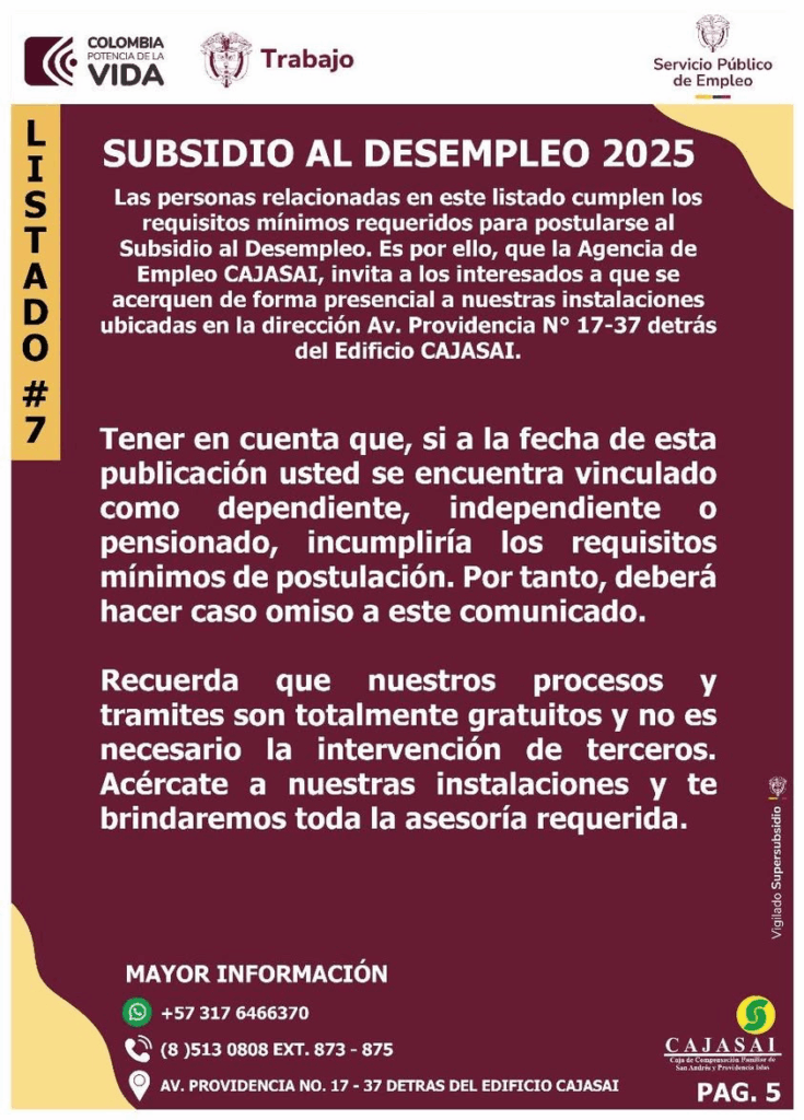 Las personas relacionadas en este listado cumplen los requisitos mínimos requeridos para postularse al Subsidio al Desempleo. Es por ello, que la Agencia de Empleo CAJASAI, invita a los interesados a que se acerquen de forma presencial a nuestras instalaciones ubicadas en la dirección Av. Providencia N° 17-37 detrás del Edificio CAJASAI.