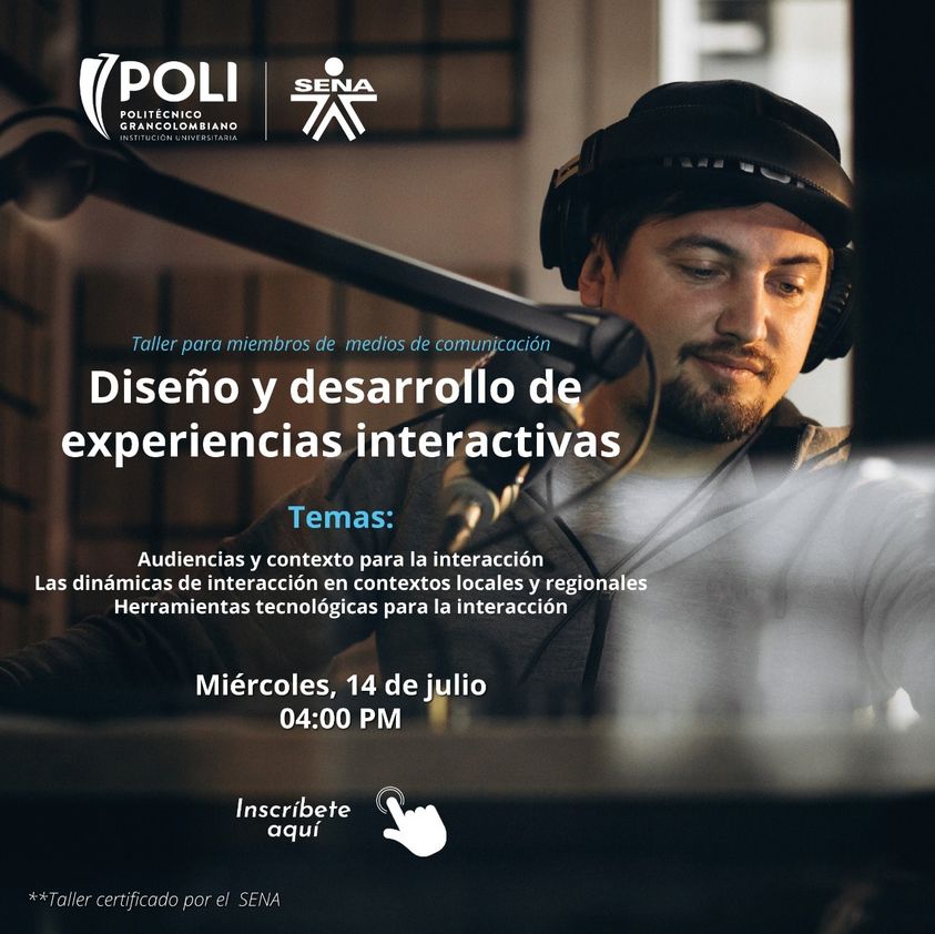 El SENA y el Politecnico Grancolombiano invitan a todos los miembros de los medios de comunicación a participar en el Taller «Diseño y desarrollo de experiencias interactivas» donde se abordarán temas como audiencias y contextos, interacción en contextos locales y regionales y herramientas tecnológicas para la interacción, este Miércoles, 14 de julio a las 4 pm.