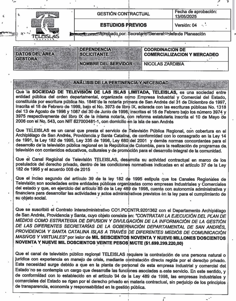 Esta empresa acredita haber participado en un Plan de Medios por 8 meses en Girardota, Antioquia en el año 2025, por valor de 62 millones de pesos. Pero se le apareció la Virgen en San Andrés y por arte de magia, en menos de un trimestre pasó a ganar el doble y por menos rienpo, ya que su contratación en Teleislas es de siete meses por valor de 120 millones de pesos, para que pueda cobrar 15 millones de pesos mensuales. Solo falta saber quien es el padrino de tan sofisticada asesora del Plan de Medios, para saber quien está detrás de la mordida.