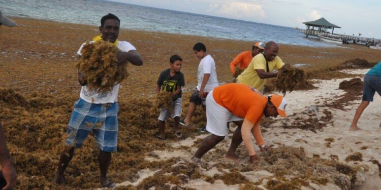 Voluntarios de la Defensa Civil Colombiana, operadores turisticos de las playas que se han visto afectados por la masiva y extensa estela de algas que cubre más de un kilometro de las playas, han trabajado incansablemente durante varias horas para retirar esos residuos vegetales marinos del sector de Sprath Bight con el proposito de habilitar esos balnearios para los bañistas que se han visto afectados por este fenomeno.